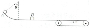 1. (水平同向传送带+能量守恒+碰撞问题)(2025·海南卷)足够长的传送带固定在竖直平面内,半径$R = 0.5m$,圆心角$\theta = 53°$的圆弧轨道与平台平滑连接,平台与顺时针匀速转动的水平传送带平滑连接,工件$A$从圆弧顶点无初速度下滑,在平台与$B$碰成一整体,$B$随后滑上传送带,已知$m_A = 4kg$,$m_B = 1kg$,$A$、$B$可视为质点,$AB$与传送带间的动摩擦因数恒定,在传送带上运动的过程中,因摩擦生热$Q = 2.5J$,忽略轨道及平台的摩擦,$g$取$10m/s^2$。