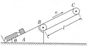 (3) 若斜面是粗糙的,将传送带改为沿逆时针方向匀速转动,速度大小不变,上述物块压缩弹簧仍在 $A$ 点由静止释放,结果物块刚好不能从传送带 $C$ 点滑出,求物块与斜面间的动摩擦因数以及物块第一次在传送带上滑行的时间。(结果可带根号)