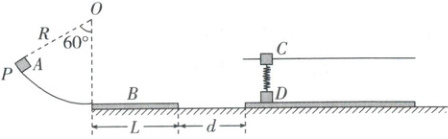 压轴挑战 5(不共线拉扯类 + 板块模型 + 圆周运动) (2025·湖南长沙期中) 如图所示,一质量 $ M = 3.0\ kg $、长 $ L = 5.15\ m $ 的长木板 $ B $ 静止放置于光滑水平面上,其左端紧靠一半径 $ R = 10\ m $ 的光滑圆弧轨道,但不粘连。圆弧轨道左端点 $ P $ 与圆心 $ O $ 的连线 $ PO $ 与竖直方向夹角为 $ 60° $,其右端最低点处与长木板 $ B $ 上表面相切。距离木板 $ B $ 右端点 $ d = 2.5\ m $ 处有一与木板等高的固定平台,平台上表面光滑,其上放置有质量 $ m = 1.0\ kg $ 的滑块 $ D $。平台上方有一固定水平光滑细杆,其上穿有一质量 $ M_0 = 2.0\ kg $ 的滑块 $ C $,滑块 $ C $ 与 $ D $ 通过一轻弹簧连接,开始时弹簧处于竖直方向。一质量 $ m = 1.0\ kg $ 的滑块 $ A $ 从 $ P $ 点静止开始沿圆弧轨道下滑。$ A $ 下滑至圆弧轨道最低点并滑上木板 $ B $,带动 $ B $ 向右运动,$ B $ 与平台碰撞后即粘在一起不再运动。$ A $ 随后继续向右运动,滑上平台,与滑块 $ D $ 碰撞并粘在一起向右运动。$ A $、$ D $ 组合体在随后运动过程中一直没有离开平台,且 $ C $ 没有滑离细杆。$ A $ 与木板 $ B $ 间动摩擦因数为 $ \mu = 0.75 $。忽略所有滑块大小及空气阻力对问题的影响。重力加速度 $ g $ 取 $ 10\ m/s^2 $,求: