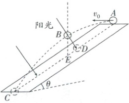 B解析:A.将小球的运动分解为沿斜面和垂直斜面两个分运动,可知小球沿斜面方向做初速度为$v_0\cos\theta$,加速度为$g\sin\theta$的匀加速直线运动,则小球在斜面上的投影做匀加速直线运动,故A正确,不符合题意;B.小球垂直斜面方向做初速度为$v_0\sin\theta$,加速度为$g\cos\theta$的匀减速直线运动,B点是运动过程中距离斜面的最远处,则此时小球垂直斜面方向的分速度刚好为0,根据对称性可知,A到B与B到C的时间相等,均为$t=\frac{v_0\sin\theta}{g\cos\theta}$,则有$L_{AD}=v_0\cos\theta· t+\frac{1}{2}g\sin\theta· t^2$,$L_{AC}=v_0\cos\theta·2t+\frac{1}{2}g\sin\theta·(2t)^2$,可得$L_{DC}=L_{AC}-L_{AD}=v_0\cos\theta· t+\frac{3}{2}g\sin\theta· t^2$,则有$\frac{L_{AD}}{L_{DC}}=\frac{v_0\cos\theta· t+\frac{1}{2}g\sin\theta· t^2}{v_0\cos\theta· t+\frac{3}{2}g\sin\theta· t^2}=\frac{1}{3}$,故B错误,符合题意;C.将小球的运动分解为水平方向的匀速运动和竖直方向的自由落体运动,则小球从A到B有$x_{AB}=v_0t$,小球从A到C有$x_{AC}=v_0·2t = 2x_{AB}$,若E点在B点的正下方,则有$x_{AC}=2x_{AE}$,可知E点是AC的中点,则$AE = EC$,故C正确,不符合题意;D.设小球落在斜面上时的速度与水平方向的夹角为$\alpha$,根据平抛运动的推论得$\tan\alpha = 2\tan\theta$,减小小球平抛的速度,$\theta$不变,小球落到斜面上时速度与水平方向夹角$\alpha$不变,落到斜面时的速度与斜面的夹角$\beta=\alpha-\theta$不变,故D正确,不符合题意。故选B。