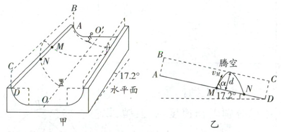 经典真题 1(斜面模型 + 斜上抛运动 + 临界极值问题 + 运动的分解)(2020·山东卷)单板滑雪 U 形池比赛是冬奥会比赛项目,其场地可以简化为如图甲所示的模型:U 形滑道由两个半径相同的四分之一圆柱面轨道和一个中央的平面直轨道连接而成,轨道倾角为 $ 17.2° $。某次练习过程中,运动员以 $ v_M = 10 \, m/s $ 的速度从轨道边缘上的 $ M $ 点沿轨道的竖直切面 $ ABCD $ 滑出轨道,速度方向与轨道边缘线 $ AD $ 的夹角 $ \alpha = 72.8° $,腾空后沿轨道边缘的 $ N $ 点进入轨道。图乙为腾空过程左视图。该运动员可视为质点,不计空气阻力,重力加速度的大小 $ g $ 取 $ 10 \, m/s^2 $,$ \sin 72.8° = 0.96 $,$ \cos 72.8° = 0.30 $。求: