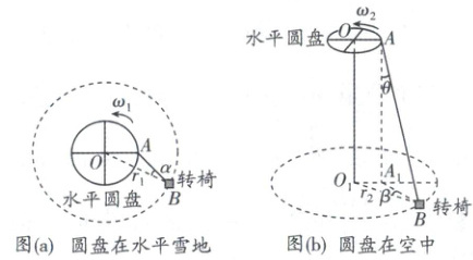 (1) 在图(a)中,若圆盘在水平雪地上以角速度 $ \omega_1 $ 匀速转动,转椅运动稳定后在水平雪地上绕 $ O $ 点做半径为 $ r_1 $ 的匀速圆周运动。求 $ AB $ 与 $ OB $ 之间夹角 $ \alpha $ 的正切值。