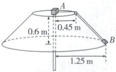 2. 巩固训练 2 圆锥摆问题 + 临界极值问题(2025·湘豫名校联考)如图,一圆台可以绕中心轴旋转,圆台下底面半径为 $ 1.25 $ m,上底面半径为 $ 0.45 $ m,高为 $ 0.6 $ m。圆台上底面粗糙,侧面光滑,质量为 $ M = 4m $ 的物块 $ A $ 放置于上底面的圆心处,物块 $ A $ 与圆台上底面之间的动摩擦因数为 $ \mu = 0.4 $,质量为 $ m $ 的物块 $ B $ 置于侧面与下底面交界处,$ A $ 与 $ B $ 通过绕过上底面边缘的光滑定滑轮的轻绳相连,且均可以视为质点,重力加速度 $ g $ 取 $ 10 $ m/s²。则系统维持该稳定状态的角速度的最大值为(