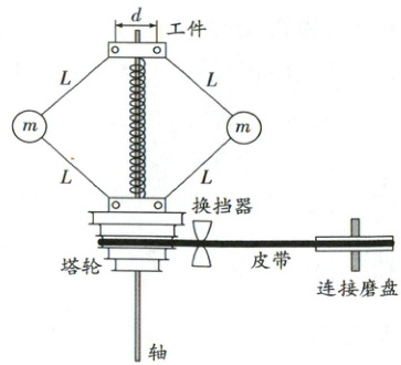 4. 压轴挑战 4 调速器原理 + 传动装置 + 圆锥摆模型(2024·湖南郴州联考)小新的家乡有很多风车磨坊,他发现风太大时,由风车带动的磨盘转速过快,容易造成磨盘的损坏,为解决这个问题,他设计了如图所示的装置用于控制磨盘转速。左边的轴由风车带动旋转,轴上端一工件固定在轴上随轴转动。轴上套着一个可以沿轴上下滑动的质量为 $ M $ 的塔轮,塔轮与轴之间的摩擦力不计。塔轮和上方工件以及两个质量 $ m = \dfrac{1}{2}M $ 的小球由四根长为 $ L $ 的轻杆通过铰链连接,上方工件上的两个铰链与塔轮上正下方对应的两个铰链之间的距离都为 $ d = 0.8L $。塔轮与上方工件之间有一个原长为 $ l_0 = 1.6L $,劲度系数为 $ k = \dfrac{3Mg}{4L} $ 的轻质弹簧。随着风车转速的增加,塔轮会向上移动,换挡器将皮带换到下方半径更小的轮上,从而减小磨盘的转速。皮带对塔轮的作用力的竖直分量忽略不计,重力加速度为 $ g $。塔轮的每一层厚度均为 $ 0.04L $,且塔轮层数足够多($ \cos 37° = 0.8 $,$ \sin 37° = 0.6 $)。