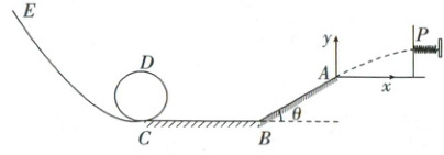(2025·陕西西安模拟)一游戏装置如图所示,图中$P$为弹射装置,$AB$为倾角$\theta = 37^{\circ}$的倾斜直轨道,$BC$为水平轨道,$C$、$D$分别为竖直圆轨道的最低点和最高点,竖直圆轨道与水平轨道相切于$C$点,$CE$为足够长的倾斜轨道,各段轨道均平滑连接,以$A$点为坐标原点,水平向右为$x$轴正方向,竖直向上为$y$轴正方向建立平面直角坐标系。已知:圆轨道半径$R = 0.3\mathrm{m}$,轨道$AB$长为$L_{1} = 1\mathrm{m}$,轨道$BC$长为$L_{2} = 0.9\mathrm{m}$。通过调节弹射装置$P$在坐标平面内的位置以及小滑块水平弹出的初速度,使滑块均能无碰撞从$A$点切入轨道$AB$,滑块与$AB$、$BC$段间动摩擦因数均为$\mu = 0.5$,其余各段轨道均光滑。滑块质量为$m = 0.3\mathrm{kg}$,滑块可视为质点,$\sin37^{\circ} = 0.6$,$\cos37^{\circ} = 0.8$,重力加速度大小$g$取$10\mathrm{m/s^{2}}$。