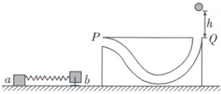 经典真题 1(弹簧类 + 斜坡类)(2025·山东卷)如图所示,内有弯曲光滑轨道的方形物体置于光滑水平面上,$ P $、$ Q $ 分别为轨道的两个端点且位于同一高度,$ P $ 处轨道的切线沿水平方向,$ Q $ 处轨道的切线沿竖直方向。小物块 $ a $、$ b $ 用轻弹簧连接置于光滑水平面上,$ b $ 被锁定。一质量 $ m = \frac{1}{2}\ kg $ 的小球自 $ Q $ 点正上方 $ h = 2\ m $ 处自由下落,无能量损失地滑入轨道,并从 $ P $ 点水平抛出,恰好击中 $ a $,与 $ a $ 粘在一起且不弹起。当弹簧拉力达到 $ F = 15\ N $ 时,$ b $ 解除锁定开始运动。已知 $ a $ 的质量 $ m_{a} = 1\ kg $,$ b $ 的质量 $ m_{b} = \frac{3}{4}\ kg $,方形物体的质量 $ M = \frac{9}{2}\ kg $,重力加速度大小 $ g $ 取 $ 10\ m/s^{2} $,弹簧的劲度系数 $ k = 50\ N/m $,整个过程弹簧均在弹性限度内,弹性势能表达式 $ E_{p} = \frac{1}{2}kx^{2} $($ x $ 为弹簧的形变量),所有过程不计空气阻力。求: