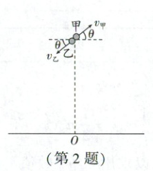 D 解析:A.炮弹竖上升到最高点时,炮弹的动量为0;炸裂成甲、乙两块弹片,根据动量守恒可知,甲、乙两弹片分离时,它们的动量大小相等,方向相反,故A错误;BCD.设两弹片分离时,甲的速度大小为$v$,由于甲、乙两块弹片的质量之比为$2:1$,根据动量守恒定律可知,乙的速度大小应为$2v$,设爆炸点的高度为$h$,对甲、乙水平方向有$x = v\cos\theta· t_1 + 2v\cos\theta· t_2$,解得$v\cos\theta = 12\ m/s$,对甲、乙竖直方向有$h = -v\sin\theta· t_1+\frac{1}{2}gt_1^2 = 2v\sin\theta· t_2+\frac{1}{2}gt_2^2$,解得$v\sin\theta = 16\ m/s$,联立解得$\tan\theta=\frac{4}{3}$,$\sin\theta=\frac{4}{5}$,$\cos\theta=\frac{3}{5}$,$v = 20\ m/s$,$h = 84\ m$,所以甲落地时距O点的距离为$x_{甲}=v\cos\theta· t_1 = 72\ m$,故BC错误,D正确.