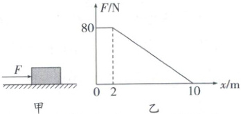 (变力做功+图像法+动能定理)(2025·安徽蚌埠一模)(多选)如图甲所示,质量为$8$kg的物体受水平推力$F$作用在水平面上由静止开始运动,推力$F$随位移$x$变化的关系如图乙所示,运动$10$m后撤去推力$F$。已知物体与地面间的动摩擦因数为$0.5$,重力加速度$g$取$10$m/s²,在物体运动的整个过程中(