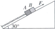 (斜面连接体模型+分离问题+变力做功+动能定理)(2024·湖北云学名校联盟联考)如图所示,倾角为$30^{\circ}$的光滑斜面固定在水平地面上,一轻质弹簧下端固定在斜面底端的挡板上,上端与质量为$1$kg的小滑块$A$相连,$A$上叠放另一个质量为$2$kg的小滑块$B$,弹簧的劲度系数为$k = 50$N/m,初始时系统处于静止状态。现用沿斜面向上的拉力$F$作用在滑块$B$上,使$B$开始沿斜面向上做加速度大小为$2$m/s²的匀加速直线运动。重力加速度$g$取$10$m/s²,不计空气阻力。从开始运动到$A$、$B$分离瞬间,拉力$F$做的功为(
