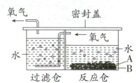 15. (6分)某化学小组的同学制作了一台简易化学“制氧机”,如图所示。该制氧机通过A、B两种物质产生氧气,其中A是过碳酸钠(2Na₂CO₃·3H₂O₂)白色固体,B是二氧化锰黑色粉末。过碳酸钠加水溶解会分解生成碳酸钠和过氧化氢。用该制氧机制氧时,在反应仓内加入适量水,再先后加入过碳酸钠和二氧化锰,反应仓内有黑色粉末翻腾,变得浑浊,仓壁变得温热,过滤仓底部导气管口有气泡冒出。