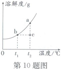 10. 硝酸钾的溶解度曲线如图所示,$a$、$b$、$c$ 三点对应的溶液分别是用 $100g$ 水配制的硝酸钾溶液。下列说法正确的是(