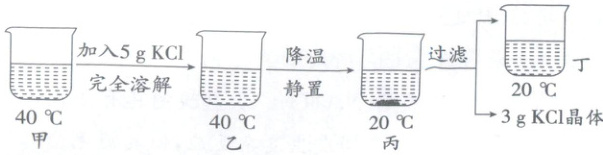 9. $20^{\circ}C$ 时 $KCl$ 的溶解度是 $34g$。取 $65gKCl$ 溶液放入甲烧杯中,按如图所示进行操作(整个过程中无溶剂损失)。以下说法正确的是(