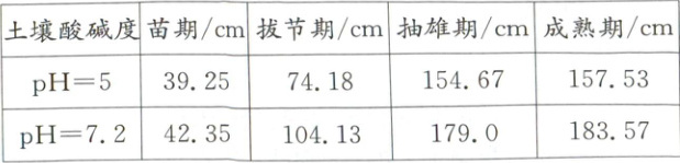 有研究人员在pH=5和pH=7.2的土壤中分别进行了实验:取土深度为20cm作为基础土样,分别施加等量的磷酸二氢铵化肥,再在玉米生长不同时期测定其株高,得到如下数据: