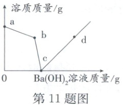 11. 向盛有硫酸和硫酸铜混合溶液的烧杯中滴入$Ba(OH)_{2}$溶液,烧杯中溶质的质量与加入的$Ba(OH)_{2}$溶液的质量关系如图所示。下列有关说法正确的是(