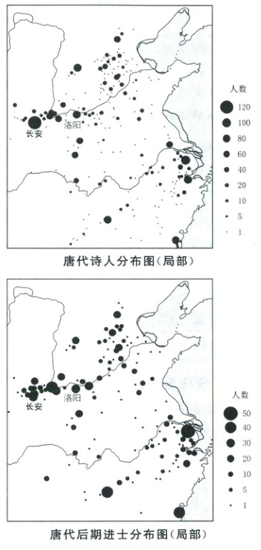 2. 该题通过呈现“唐代诗人分布图”“唐代后期进士分布图”两则史料,要求学生从中得出一个关于唐代历史的认识。学生首先应通过这两幅图的主题以及其中反映的空间信息,解读题目意图,进而调动教材中关于唐代历史的知识,特别是关于唐代诗歌、唐代进士科的知识,形成认识,并对自己为何有此认识加以说明。直观地比较两幅图,可以发现,唐代诗人与唐代后期进士在地理分布上高度重合;且在长安与洛阳之间、华北平原、长江中下游或者江南地区,唐代诗人与唐代后期进士的分布都非常密集,这一层可以整体把握,也可以分区或个别把握;还可以发现一些区域诗人与进士分布很少。将上述直观比较得出的印象,结合相关历史知识表述出来,形成认识,并加以说明,便可完成题目要求。例如,可以得出认识:唐代后期进士地区分布与唐代诗人分布区域高度重合。可论述唐代是诗歌繁荣的时代,唐代后期诗歌是进士考试的重要内容,进士也常常是著名诗人,诗人与进士在地理分布上多有重合。还可论述唐代诗人、进士分布与地区经济发展之间的关系。(12分)