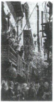 5. (2025 浙江高考)位于太平洋东岸的旧金山,是华工漂洋过海登陆美国的第一站。1880 年《哈泼斯周报》图绘(见右图),生动再现了旧金山唐人街庆贺新年的场景:其中有数位白人面孔,各商铺的小伙子竞相高挑鞭炮,争夺头彩,人们拱手作揖,互相拜年。作为史料,该图反映了(
