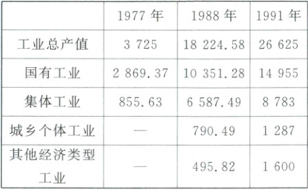 11. D 【解析】从表格数据来看,国有工业产值虽有增长,但多种非国有工业产值也在不断增加,说明所有制结构不再单一,故选 D项;材料仅呈现全国工业的整体产值和所有制类型的变化,未提及区域分布,排除 A项;建立社会主义市场经济体制的目标是1992年中共十四大才提出的,排除 B项;建立现代企业制度是1993年中共十四届三中全会才系统提出的,排除 C项。
