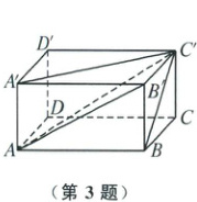 3.ACD【解析】因为$BC// B'C'$,所以$\angle A'C'B'$就是$BC$和$A'C'$所成的角.因为$\triangle A'B'C'$是等腰直角三角形,所以$\angle A'C'B'=45^{\circ}$,故A正确.因为$AA'// BB'$,所以$\angle B'BC'$就是$AA'$和$BC'$所成的角.因为$\tan\angle B'BC'=\frac{B'C'}{BB'}=\frac{6}{2\sqrt{3}}=\sqrt{3}$,所以$\angle B'BC'=60^{\circ}$,故B错误.连接$AC$,则$\angle CAC'$就是$AC'$与底面$ABCD$所成的角,且$\tan\angle CAC'=\frac{CC'}{AC}=\frac{2\sqrt{3}}{6\sqrt{2}}=\frac{\sqrt{6}}{6}$,故C正确.易知$\angle BAB'$是$AB'$与底面$ABCD$所成的角,且$\tan\angle BAB'=\frac{BB'}{AB}=\frac{2\sqrt{3}}{6}=\frac{\sqrt{3}}{3}$,所以$\angle BAB'=30^{\circ}$,故D正确.