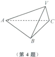 4.$\frac{5}{6}$[解析]如图,取AB的中点M,连接VM,CM.因为VA = VB,AC = BC,所以VM⊥AB,CM⊥AB,所以∠VMC为二面角V - AB - C的平面角.根据已知条件可得CM = $\sqrt{3}$,VM = $\sqrt{3}$.在△VMC中,由余弦定理得$\cos\angle VMC = \frac{VM^{2} + MC^{2} - VC^{2}}{2VM· MC} = \frac{5}{6}$,所以二面角V - AB - C的余弦值是$\frac{5}{6}$.