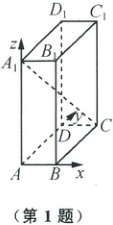 1.B 【解析】由题意知$A_1(0,0,3),B(1,0,0),C(1,2,0)$,则$\overrightarrow{A_1C}=(1,2,-3),\overrightarrow{BC}=(0,2,0),A_1C$对应的单位方向向量$\mu=(\frac{1}{\sqrt{14}},\frac{2}{\sqrt{14}},-\frac{3}{\sqrt{14}})$,所以点B到直线$A_1C$的距离为$\sqrt{|\overrightarrow{BC}|^2-(\overrightarrow{BC}·\mu)^2}=\sqrt{4-\frac{8}{7}}=\frac{2\sqrt{35}}{7}$。