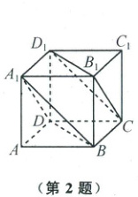 2.D 【解析】如图,建立空间直角坐标系,则$A_1(1,0,1),B(1,1,0),D(0,0,0),C(0,1,0),\overrightarrow{DA_1}=(1,0,1),\overrightarrow{DB}=(1,1,0),\overrightarrow{DC}=(0,1,0)$。设平面$A_1DB$的法向量为$n=(x,y,z)$,则$\begin{cases}n·\overrightarrow{DA_1}=x+z=0,\\n·\overrightarrow{DB}=x+y=0.\end{cases}$不妨令$x=1$,则$y=-1,z=-1$,所以$n=(1,-1,-1)$。易知平面$A_1DB//$平面$D_1CB_1$,所以平面$A_1DB$与平面$D_1CB_1$间的距离$d=\frac{|\overrightarrow{DC}· n|}{|n|}=\frac{1}{\sqrt{3}}=\frac{\sqrt{3}}{3}$。