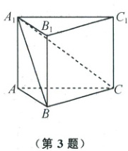 3.C 【解析】在直三棱柱$ABC - A_1B_1C_1$中,设点A到平面$A_1BC$的距离为$h$,则$V_{A - A_1BC}=\frac{1}{3}S_{\triangle A_1BC}· h=\frac{2\sqrt{2}}{3}h=V_{A_1 - ABC}=\frac{1}{3}S_{\triangle ABC}· A_1A=\frac{1}{3}V_{ABC - A_1B_1C_1}=\frac{4}{3}$,解得$h=\sqrt{2}$,所以点A到平面$A_1BC$的距离为$\sqrt{2}$。