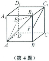 4.$\frac{\sqrt{30}}{5}$ 【解析】以D为坐标原点建立如图所示的空间直角坐标系,则$A_1(1,0,1),B_1(1,1,1),E(0,0,\frac{1}{2}),F(1,1,\frac{1}{2}),C_1(0,1,1),A(1,0,0)$。因为$\overrightarrow{AE}=(-1,0,\frac{1}{2}),\overrightarrow{FC_1}=(-1,0,\frac{1}{2})$,所以$\overrightarrow{AE}//\overrightarrow{FC_1}$,即$AE// FC_1$,所以点F到直线AE的距离即为直线$FC_1$到直线AE的距离。因为$u=\frac{\overrightarrow{AE}}{|\overrightarrow{AE}|}=(-\frac{2\sqrt{5}}{5},0,\frac{\sqrt{5}}{5})$,$\overrightarrow{AF}=(0,1,\frac{1}{2}),|\overrightarrow{AF}|^2=\frac{5}{4},\overrightarrow{AF}· u=\frac{\sqrt{5}}{10}$,所以直线$FC_1$到直线AE的距离为$\sqrt{\frac{5}{4}-(\frac{\sqrt{5}}{10})^2}=\frac{\sqrt{30}}{5}$。