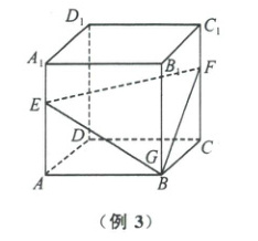 例3 B[解析]如图,取D₁C₁的中点N,D₁A₁的中点M,连接MN,NF,ME,则五边形BEMNF为过点B,E,F的截面,取CF的中点J,DD₁靠近D₁的三等分点K,连接D₁J,CK,EK,则NF//D₁J。又CJ//D₁K且CJ = D₁K,所以四边形CJD₁K为平行四边形,所以CK//D₁J,则NF//CK。又EK//BC且EK = BC,所以四边形EKCB为平行四边形,所以EB//CK,则NF//BE,所以N,F,B,E四点共面。分别取BB₁,AA₁靠近B,A的三等分点G,H,连接C₁G,GH,D₁H,同理可证BF//C₁G,D₁H//C₁G,D₁H//EM,所以BF//EM,所以B,F,M,E四点共面,所以N,F,B,E,M五点共面。又NF = ME = $\sqrt{2² + 3²}$ = $\sqrt{13}$,BE = BF = $\sqrt{4² + 6²}$ = 2$\sqrt{13}$,MN = $\sqrt{3² + 3²}$ = 3$\sqrt{2}$,所以截面的周长为6$\sqrt{13}$ + 3$\sqrt{2}$。
