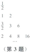 3.1792【解析】由$1+2+·s+13=\frac{13×14}{2}=91<100,1+2+·s+14=\frac{14×15}{2}=105\geq100$,$100-91=9$,知$a_{100}$是第14行的第9个数.而每一行的第一个数构成首项和公差均为$\frac{1}{2}$的等差数列,从而第14行的第一个数是$\frac{1}{2}+\frac{14-1}{2}=7$.又因为每一行成公比为2的等比数列,故第14行的第9个数等于$7×2^{9-1}=7×256=1792$。