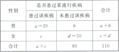 2 ABC 【解析】根据列联表中的数据可求得$a = 20$,$b = 30$,$c =10$,$d = 50$.对于A,代入计算可得$\frac{a}{a + b} = \frac{2}{5} > \frac{c}{c + d} = \frac{1}{6}$,故A正确;对于B,经计算可得$\chi^{2} = \frac{110 × (20 × 50 - 30 × 10)^{2}}{30 × 80 × 50 × 60} \approx 7.486 >6.635$,故B正确;对于C,D,结合附表数值以及独立性检验的实际意义,根据小概率值$\alpha = 0.01$的独立性检验,认为是否患过该流行疾病与性别有关联,故C正确,D错误.