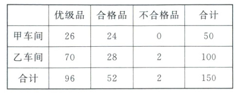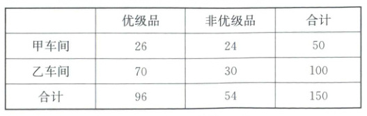 可得$\chi^{2} = \frac{150 × (26 × 30 - 24 × 70)^{2}}{50 × 100 × 96 × 54} = \frac{75}{16} = 4.6875$.因为$4.6875 > 3.841$,所以有$95\%$的把握认为甲、乙两车间产品的优级品率存在差异.因为$4.6875 < 6.635$,所以没有$99\%$的把握认为甲、乙两车间产品的优级品率存在差异.