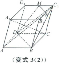 (2)AD [解析]在平行六面体$ABCD - A_1B_1C_1D_1$中,令$\overrightarrow{AB}=\boldsymbol{a},\overrightarrow{AD}=\boldsymbol{b},\overrightarrow{AA_1}=\boldsymbol{c}$,不妨令$|\boldsymbol{a}| = |\boldsymbol{b}| = |\boldsymbol{c}| = 1$,依题意,$\boldsymbol{a}·\boldsymbol{b}=\frac{1}{2},\boldsymbol{b}·\boldsymbol{c}=\frac{1}{2},\boldsymbol{c}·\boldsymbol{a}=\frac{1}{2},\overrightarrow{AC_1}=\boldsymbol{a}+\boldsymbol{b}+\boldsymbol{c}$,因点$M,N$分别是棱$D_1C_1,C_1B_1$的中点,则$\overrightarrow{MN}=\frac{1}{2}\overrightarrow{DB_1}=\frac{1}{2}(\boldsymbol{a}-\boldsymbol{b}),\overrightarrow{MN}·\overrightarrow{AC_1}=\frac{1}{2}(\boldsymbol{a}-\boldsymbol{b})·(\boldsymbol{a}+\boldsymbol{b}+\boldsymbol{c})=\frac{1}{2}(\boldsymbol{a}^2-\boldsymbol{b}^2+\boldsymbol{a}·\boldsymbol{c}-\boldsymbol{b}·\boldsymbol{c})=0$,故$MN\perp AC_1$,A正确;$\overrightarrow{AN}=\overrightarrow{AB}+\overrightarrow{BB_1}+\frac{1}{2}\overrightarrow{B_1C_1}=\boldsymbol{a}+\frac{1}{2}\boldsymbol{b}+\boldsymbol{c}$,若向量$\overrightarrow{AN},\overrightarrow{BC},\overrightarrow{BB_1}$共面,则存在唯一实数对$\lambda,\mu$使得$\overrightarrow{AN}=\lambda\overrightarrow{BC}+\mu\overrightarrow{BB_1}$,即$\boldsymbol{a}+\frac{1}{2}\boldsymbol{b}+\boldsymbol{c}=\lambda\boldsymbol{b}+\mu\boldsymbol{c}$,而$\boldsymbol{a},\boldsymbol{b},\boldsymbol{c}$不共面,则有$1 = 0$,显然不成立,B不正确;因为$\overrightarrow{CA_1}=-\boldsymbol{a}-\boldsymbol{b}+\boldsymbol{c},\overrightarrow{C_1B}=-\boldsymbol{b}-\boldsymbol{c},\overrightarrow{CA_1}·\overrightarrow{C_1B}=(-\boldsymbol{a}-\boldsymbol{b}+\boldsymbol{c})·(-\boldsymbol{b}-\boldsymbol{c})=\boldsymbol{a}·\boldsymbol{b}+\boldsymbol{a}·\boldsymbol{c}+\boldsymbol{b}^2-\boldsymbol{c}^2=1$,所以$CA_1$与$C_1B$不垂直,而$C_1B\subset$平面$C_1BD$,故$CA_1$不垂直平面$C_1BD$,C不正确;如图,连接$A_1B,A_1D$,依题意,$A_1B = A_1D = BD = AA_1 = AB = AD$,即四面体$A_1ABD$是正四面体,因此,平行六面体的高等于点$A_1$到平面$ABD$的距离,即正四面体$A_1ABD$的高$h$.由$\overrightarrow{A_1B}·\overrightarrow{AC_1}=(\boldsymbol{a}-\boldsymbol{c})·(\boldsymbol{a}+\boldsymbol{b}+\boldsymbol{c})=\boldsymbol{a}^2-\boldsymbol{c}^2+\boldsymbol{a}·\boldsymbol{b}-\boldsymbol{b}·\boldsymbol{c}=0$知$AC_1\perp A_1B$,由选项A知$AC_1\perp BD$,而$A_1B\cap BD = B,A_1B,BD\subset$平面$A_1BD$,则$AC_1\perp$平面$A_1BD$,$AC_1$是平面$A_1BD$的一个法向量,$\overrightarrow{AB}·\overrightarrow{AC_1}=\boldsymbol{a}·(\boldsymbol{a}+\boldsymbol{b}+\boldsymbol{c})=2$,$|\overrightarrow{AC_1}|=\sqrt{(\boldsymbol{a}+\boldsymbol{b}+\boldsymbol{c})^2}=\sqrt{\boldsymbol{a}^2+\boldsymbol{b}^2+\boldsymbol{c}^2+2\boldsymbol{a}·\boldsymbol{b}+2\boldsymbol{b}·\boldsymbol{c}+2\boldsymbol{c}·\boldsymbol{a}}=\sqrt{6}$,则$h=\frac{|\overrightarrow{AB}·\overrightarrow{AC_1}|}{|\overrightarrow{AC_1}|}=\frac{2}{\sqrt{6}}=\frac{\sqrt{6}}{3}$,所以该平行六面体的高为$\frac{\sqrt{6}}{3}$,D正确.