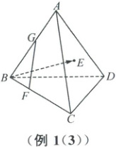 (3)$\frac{\sqrt{42}}{21}$【解析】根据题意,$BE\perp$平面$ACD$,因此,直线$FG$与平面$ACD$所成角的正弦值即为直线$FG$与直线$BE$所成角的余弦值的绝对值。$\overrightarrow{BE}=\frac{1}{3}(\overrightarrow{BA}+\overrightarrow{BC}+\overrightarrow{BD})$,则$\overrightarrow{BE^{2}}=\frac{1}{9}(\overrightarrow{BA^{2}}+\overrightarrow{BC^{2}}+\overrightarrow{BD^{2}}+2\overrightarrow{BA}·\overrightarrow{BC}+2\overrightarrow{BA}·\overrightarrow{BD}+2\overrightarrow{BC}·\overrightarrow{BD})=\frac{1}{9}×(4 + 4 + 4 + 4 + 4 + 4)=\frac{24}{9}$,即$|\overrightarrow{BE}|=\frac{2\sqrt{6}}{3}$。$\overrightarrow{FG}=\frac{1}{2}\overrightarrow{BA}-\frac{1}{3}\overrightarrow{BC}$,且$|\overrightarrow{FG}|=|\frac{1}{2}\overrightarrow{BA}-\frac{1}{3}\overrightarrow{BC}|=\sqrt{(\frac{1}{2}\overrightarrow{BA}-\frac{1}{3}\overrightarrow{BC})^{2}}=\sqrt{\frac{1}{4}\overrightarrow{BA^{2}}+\frac{1}{9}\overrightarrow{BC^{2}}-\frac{1}{3}\overrightarrow{BA}·\overrightarrow{BC}}=\sqrt{\frac{1}{4}×4+\frac{1}{9}×4-\frac{1}{3}×2}=\frac{\sqrt{7}}{3}$,故$\cos\langle\overrightarrow{BE},\overrightarrow{FG}\rangle=\frac{\overrightarrow{BE}·\overrightarrow{FG}}{|\overrightarrow{BE}|·|\overrightarrow{FG}|}=\frac{\frac{1}{3}(\overrightarrow{BA}+\overrightarrow{BC}+\overrightarrow{BD})·(\frac{1}{2}\overrightarrow{BA}-\frac{1}{3}\overrightarrow{BC})}{\frac{2\sqrt{6}}{3}×\frac{\sqrt{7}}{3}}=\frac{\frac{1}{3}(\frac{1}{2}\overrightarrow{BA^{2}}+\frac{1}{6}\overrightarrow{BA}·\overrightarrow{BC}+\frac{1}{2}\overrightarrow{BA}·\overrightarrow{BD}-\frac{1}{3}\overrightarrow{BC^{2}}-\frac{1}{3}\overrightarrow{BC}·\overrightarrow{BD})}{\frac{2\sqrt{6}}{3}×\frac{\sqrt{7}}{3}}=\frac{\frac{1}{3}×(2+\frac{1}{3}+1-\frac{4}{3}-\frac{2}{3})}{\frac{2\sqrt{6}}{3}×\frac{\sqrt{7}}{3}}=\frac{\frac{4}{9}}{\frac{2\sqrt{6}}{3}×\frac{\sqrt{7}}{3}}=\frac{\sqrt{42}}{21}$,则直线$FG$与平面$ACD$所成角的正弦值为$\frac{\sqrt{42}}{21}$。