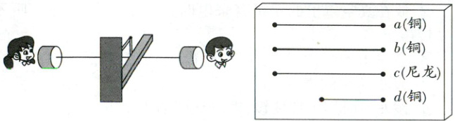 (3)某研究小组利用以上两个纸杯和一些长短、粗细不同的琴弦,又进行了探究“音调和哪些因素有关”的活动。他们选用的琴弦长度、材料在图中已标出(其中琴弦的直径关系:$a = c = d < b$),并且每根琴弦固定在“音箱”上的松紧程度一致。