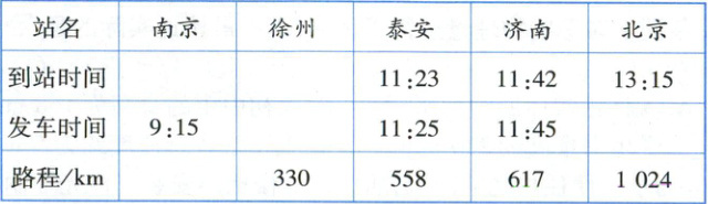 20. 近些年中国高铁的发展十分迅速,下表为某次高铁列车从南京到北京的运行时刻表的一部分。
