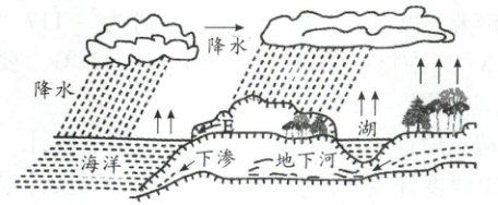 如图是大自然中水循环现象的示意图。江、河、湖、海以及大地表层中的水不断蒸发变成水蒸气。当含有很多水蒸气的空气升入高空时,水蒸气的温度降低变成小水滴或凝成小冰晶,这就是云。在一定条件下,云中的小水滴和小冰晶越来越大,就会下落。在下落过程中,小冰晶又变成小水滴,与原来的水滴一起落到地面,这就形成了雨。