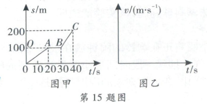 15. 如图甲所示,是某小轿车沿直线运动时的s-t图像,根据图甲请你分析这辆车的运动情况,并在图乙中画出汽车在这段时间内的v-t图像。