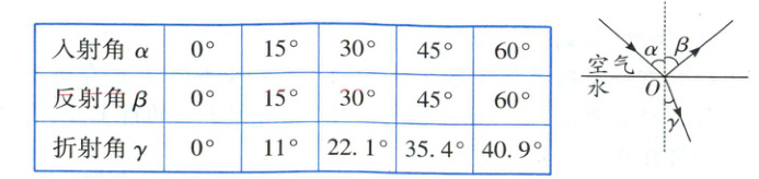 19. 某同学在做“探究光的折射特点”实验,如图是光从空气射入水中时的光路。实验中发现,入射光线、折射光线和法线在同一平面内,折射光线和入射光线分别位于法线的两侧。通过实验还得到如下表所示的数据:
