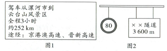 (1)小明的爸爸利用导航系统查询路线,得知从漯河市到云台山风景区,全程约 252 km,途经京港澳高速、晋新高速,全程用时 3 小时,如图 1 所示。参照导航系统的信息,请你计算该段路程驾车行驶的平均速度是多少?