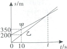 7.72 40 < 【解析】由图可知,t = 10 s 时,$s_{甲} = 350 m - 200 m = 150 m,$$s_{乙} = 200 m,$则$v_{甲} = \frac{s_{甲}}{t} = \frac{150 m}{10 s} = 15 m/s,$$v_{乙} = \frac{s_{乙}}{t} = \frac{200 m}{10 s} = 72 km/h;$乙车追上甲车需要的时间为t',则根据题意可得$v_{甲}t' + 200 m = v_{乙}t',$即15 m/s × t' + 200 m = 20 m/s × t',解得t' = 40 s;由图像知两车做匀速直线运动,所以$v_{甲} < v_{乙}。$故答案为:72 40 <。
