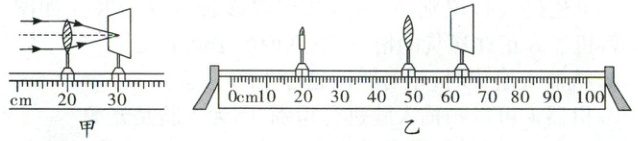 (1) 将平行光正对凸透镜,移动光屏,直到光屏上形成一个最小、最亮的光斑,如图甲所示,该凸透镜的焦距为