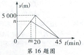 16.AD 【解析】A.根据图像可知,小希和妈妈同行时(时间0~m分钟),20 min通过的路程为5000 m,所以她们同行时的速度$v = \frac{s}{t} = \frac{5000 m}{2 min} = \frac{5 km}{\frac{20}{60} h} = 15 km/h,$故A正确;B.由图像可知小希是第20 min后沿原路返回的,妈妈返回后5 min小希马上返回,所以妈妈沿原路返回的时刻为20 min - 5 min = 15 min,即m的值是15,n的值是$n = \frac{5000 m - 15 km/h × 5 min}{} = 5000 m - \frac{15}{3.6} m/s × 5 × 60 s = 3750 m,$故B错误;C.妈妈返回的速度为$v = \frac{n}{t_1} = \frac{3750 m}{45 min - 15 min} = 125 m/min,$小希开始返回时与妈妈的距离为$Δs = s - n + v_1Δt = 5000 m - 3750 m + 125 m/min × (20 min - 15 min) = 1875 m,$故C错误;D.小希返回的速度为$v_2 = \frac{s}{t_2} = \frac{5000 m}{45 min - 20 min} = 200 m/min,$20~30 min,两人运动的距离差为$Δs' = (v_2 - v_1)t_3 = (200 m/min - 125 m/min) × 10 min = 750 m,$经过30 min,两人相距Δs'' = Δs - Δs' = 1875 m - 750 m = 1125 m,故D正确。故选:AD。
