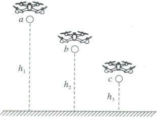 5. (2025·江西省南昌十九中模拟)某次军事演习中,无人机被用来投放炸弹。如图所示,有三架无人机静止在空中,离地面的高度之比$h_{1}:h_{2}:h_{3}=3:2:1$。若同时由静止释放炸弹$a$、$b$、$c$,不计空气阻力,则以下说法正确的是( )