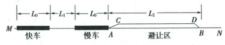 7. 如下图所示,两列长度均为$L_0$的快车和慢车沿着同一直轨道同向匀速行驶,当慢车头到避让区起点$C$时,快车头与慢车尾间的距离为$L_1$,且快车的速度是慢车速度的$2$倍。为避免撞车,慢车要进入避让区$CD$轨道进行避让。若两车都不减速,$L_1$至少应为多少?避让区长度$L_2$至少为多少?(设避让区轨道$CD$平行于轨道$AB$,且弯曲部分$AC$、$BD$很短,可忽略不计)