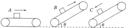 5. (多选)如下图所示,$ A $、$ B $、$ C $ 三个物体质量相等,它们与传送带间的动摩擦因数相同,三个物体随传送带一起匀速运动,运动方向如图中箭头所示,则下列说法正确的是( )