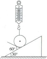 5. (2024·河北卷,5)如图,弹簧测力计下端挂有一质量为 $ 0.20\ kg $ 的光滑均匀球体,球体静止于带有固定挡板的斜面上,斜面倾角为 $ 30^{\circ} $,挡板与斜面夹角为 $ 60^{\circ} $。若弹簧测力计位于竖直方向,读数为 $ 1.0\ N $,$ g $ 取 $ 10\ m/s^2 $,挡板对球体支持力的大小为( )
