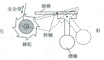 4. 一种汽车安全带控制装置的示意图如图所示,汽车处于静止或匀速直线运动状态时,摆锤竖直悬挂,锁棒水平,棘轮可以自由转动,安全带能被拉动。当汽车突然刹车时,摆锤由于惯性绕轴摆动,使得锁棒锁定棘轮的转动,安全带不能被拉动。若摆锤从图中实线位置摆到虚线位置,汽车可能的运动方向和运动状态是( )