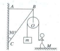 6. 如下图所示,轻杆 $ BC $ 的 $ C $ 点用光滑铰链与墙壁固定,杆的 $ B $ 点通过水平细绳 $ AB $ 使杆与竖直墙壁保持 $ 30^{\circ} $ 的夹角,若在 $ B $ 点悬挂一个质量不计的定滑轮,某人用它匀速地提起重物。已知重物的质量 $ m = 30 \, kg $,人的质量 $ M = 50 \, kg $,$ g = 10 \, m/s^2 $。