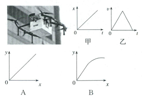 1. (2025·广东省深圳市龙岗区高一期末)无人机送餐服务在深圳试行。通过机载传感器能描绘出无人机运动的图象,图甲是沿水平方向的$x-t$图象,图乙是沿竖直方向的$v-t$图像。则无人机的运动轨迹近似为( )