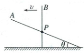 【例】 如下图所示,水平面上固定一个与水平面夹角为$\theta$的斜杆$A$,另一竖直杆$B$以速度$v$水平向左做匀速直线运动,则从两杆相交到最后分离的过程中,两杆交点$P$的速度方向和大小分别为( )
